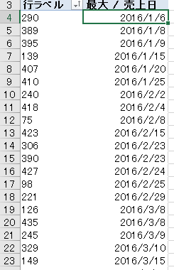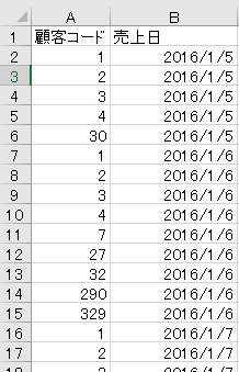 最新購買日を調べるには同じ顧客コードの一番新しい売上日を抽出すればいいのですが、今回はピボットテーブルの機能を使いたいと思います。
